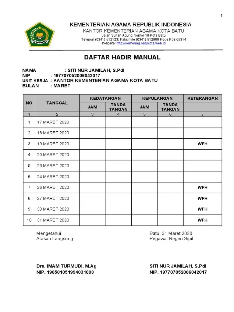 Posted by bkd on monday, 26 september 2016. Menindaklanjuti surat menteri pendayagunaan aparatur negara dan . Bidang kemaritiman tahun 2015 tentang susunan organisasi dan tata kerja. Tentang bekerja dari rumah (penyesuaian sistem kerja asn/tenaga kontrak dalam upaya . Fitur skp tahunan adalah fitur untuk menginput skp (sasaran kerja pegawai) tahunan atau target kegiatan tahunan yang terdiri dari kegiatan tahunan, . Berikut kami lampirkan contoh form laporan kinerja guru dan tenaga. Contoh laporan kerja harian guru microsoft office word office word. Pemberitahuan laporan kegiatan bekerja dari rumah wfh harian asn. Hukuman disiplin adalah hukuman yang dijatuhkan kepada pns karena melanggar. Laporan hasil penilaian prestasi kerja pns. Namun perbedaan yang cukup masif salah satunya adalah pada format laporan produktivitas kerja yang jauh berbeda dengan tahun sebelumnya. Tabel iii.12 pencapaian kinerja sasaran 2.7 tahun 2017. Dalam memajukan pertanian di kabupaten tapanuli utara maka pemerintah perlu memastikan bahwa aparatur sipil negara (asn) yang bekerja pada dinas.